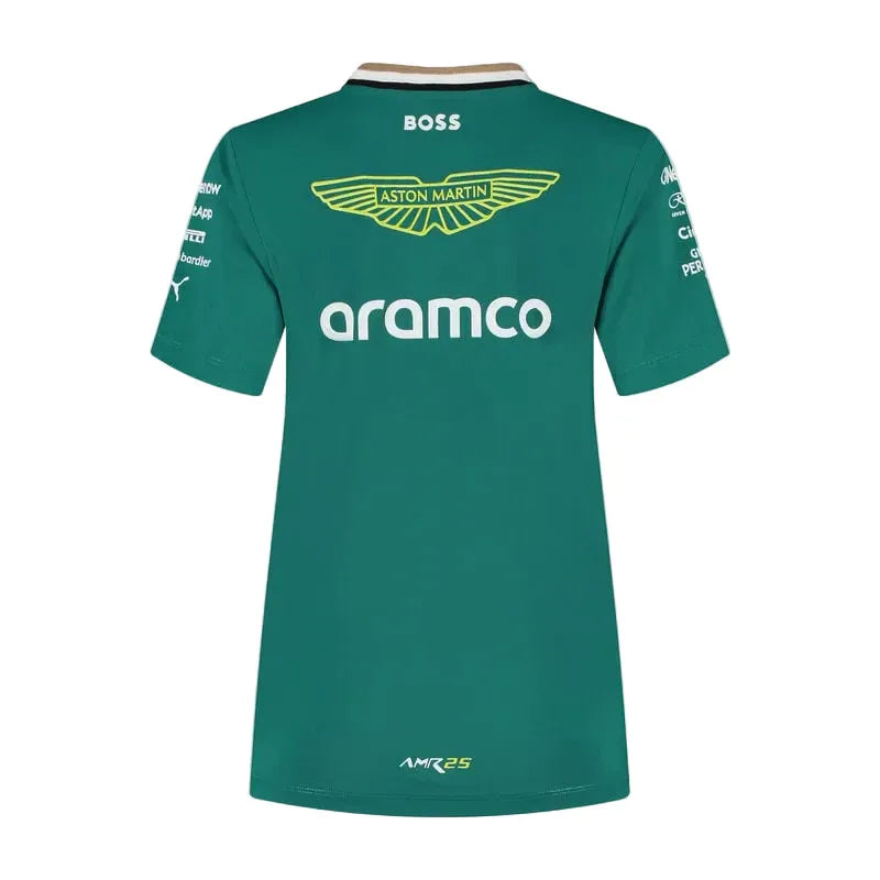 Women's version of the official 2025 Team Replica T-shirt, as seen worn throughout the 2025 Formula One® season. The Women's T-shirt comes in a female fit, with a performance moisture wicking fabric, textured knit side panels, and features all the official 2025 Aston Martin Formula One® Team and partner branding.